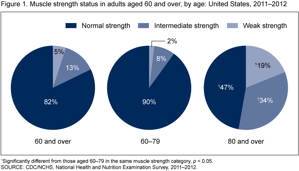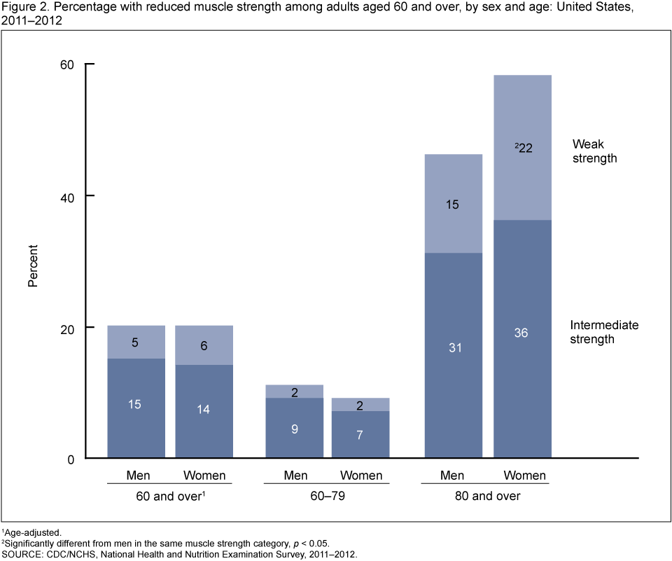Looker AC, Wang CY. Prevalence of reduced muscle strength in older U.S. adults: United States, 2011–2012. NCHS data brief, no 179. Hyattsville, MD: National Center for Health Statistics. 2015.