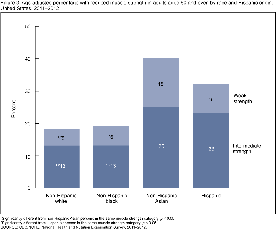 - Non-Hispanic Asian and Hispanic persons had a higher prevalence of reduced muscle strength than non-Hispanic white persons.
