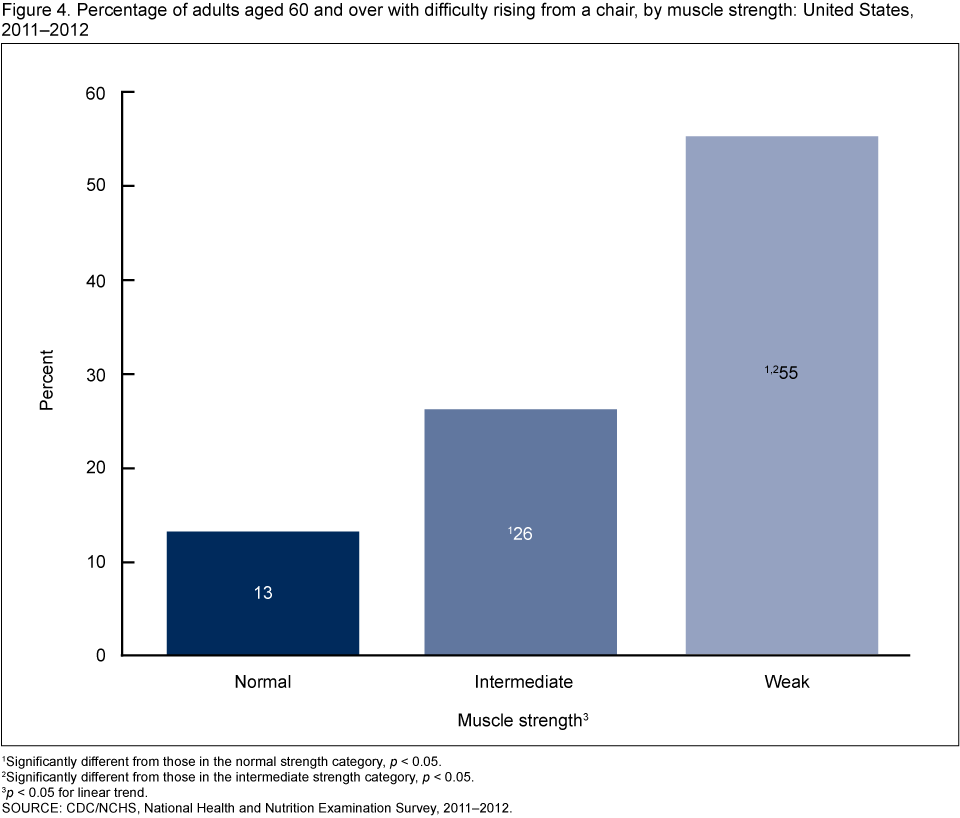 Figure 4. Percentage of adults aged 60 and over with difficulty rising from a chair, by muscle strength: United States, 2011–2012