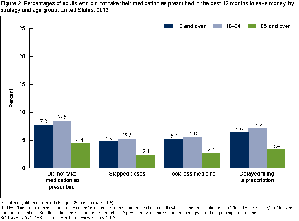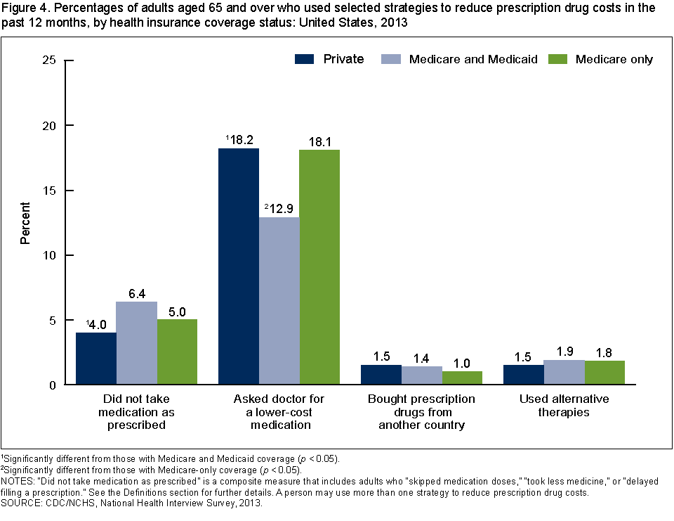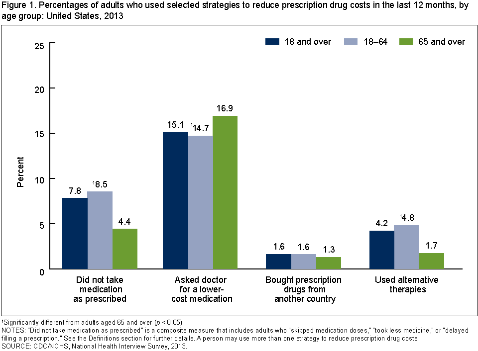 Cohen RA, Villarroel MA. Strategies used by adults to reduce their prescription drug costs: United States, 2013. NCHS data brief, no 184. Hyattsville, MD: National Center for Health Statistics. 2015.