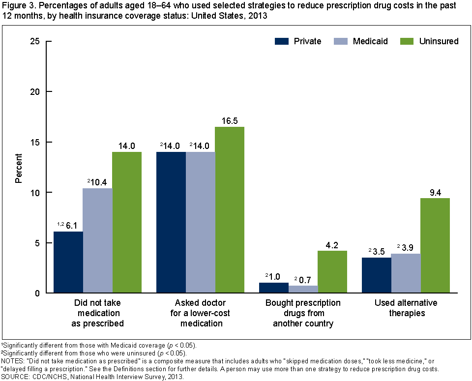 • Adults aged 18–64 who were uninsured were more likely to have asked their doctor for a lower-cost medication (16.5%), to have not taken their medication as prescribed (14.0%), to have used alternative therapies (9.4%), and to have bought prescription drugs from another country (4.2%) to save money, compared with those who had private coverage (14.0%, 6.1%, 3.5%, and 1.0%, respectively) and those who had Medicaid coverage (14.0%, 10.4%, 3.9%, and 0.7%, respectively) (Figure 3).