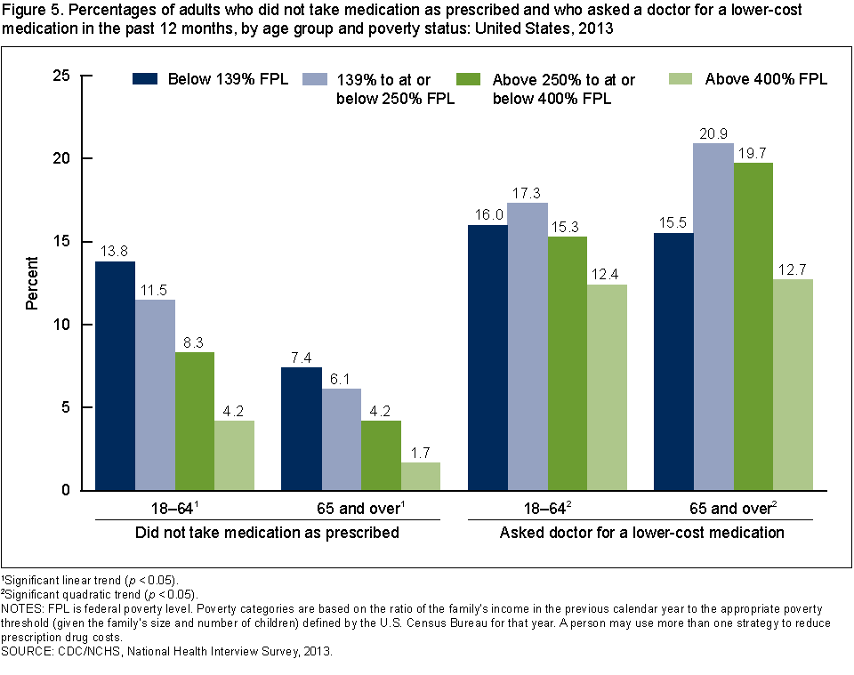• Among adults aged 18–64, the percentage who asked their doctor for a lower-cost medication to save money was highest among those with incomes at or below 250% of the federal poverty level (FPL). The percentages decreased from 17.3% for those with incomes from 139% through 250% FPL to 12.4% among those with incomes above 400% FPL.