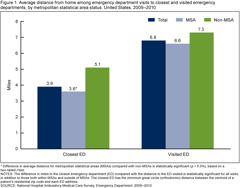 - In 2009–2010, visits to emergency departments (EDs) occurred an average 6.8 miles from the patient’s residence, while the nearest ED was 3.9 miles from the home.