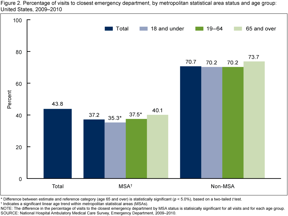 Figure 2. Percentage of visits to closest emergency department, by metropolitan statistical area status and age group: United States, 2009–2010