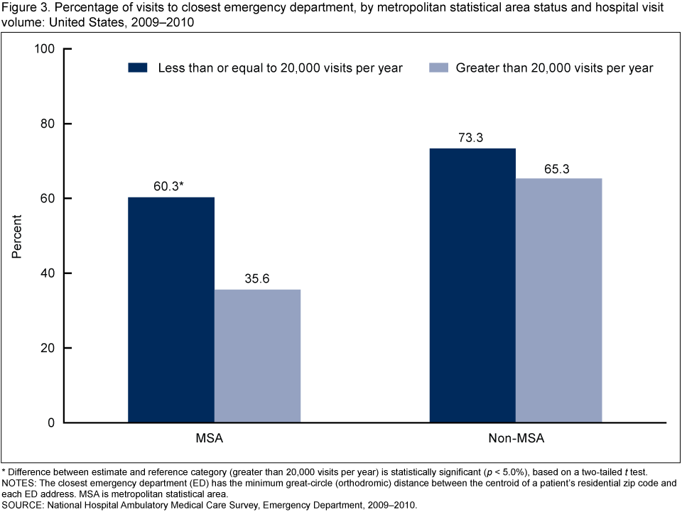 - Among those who visited an ED, the nearest ED was significantly closer to home (3.6 miles) for visits within metropolitan statistical areas (MSAs) compared with those outside of MSAs (5.1 miles).