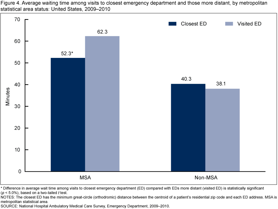 - Outside of MSAs, average wait time did not differ between visits to the closest ED and the ED visited.