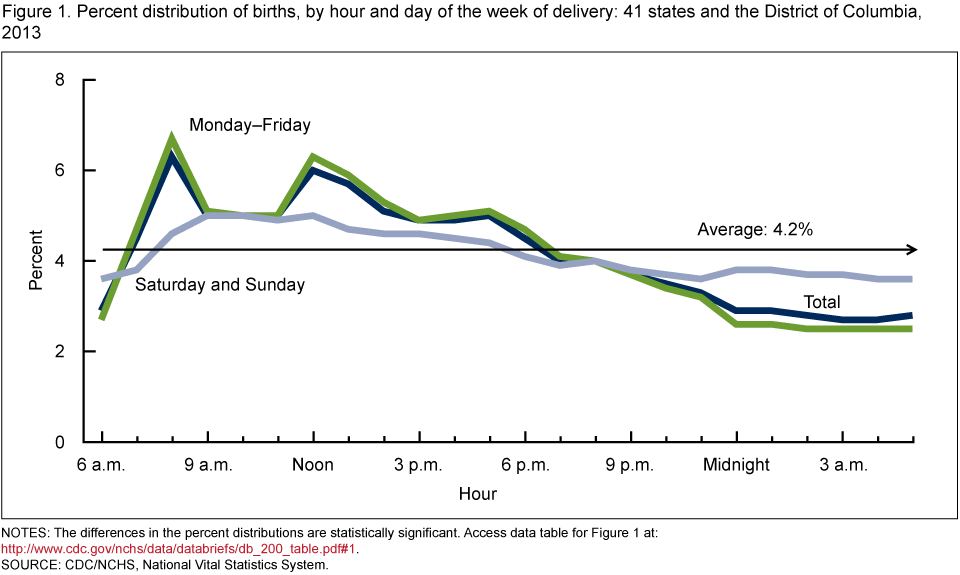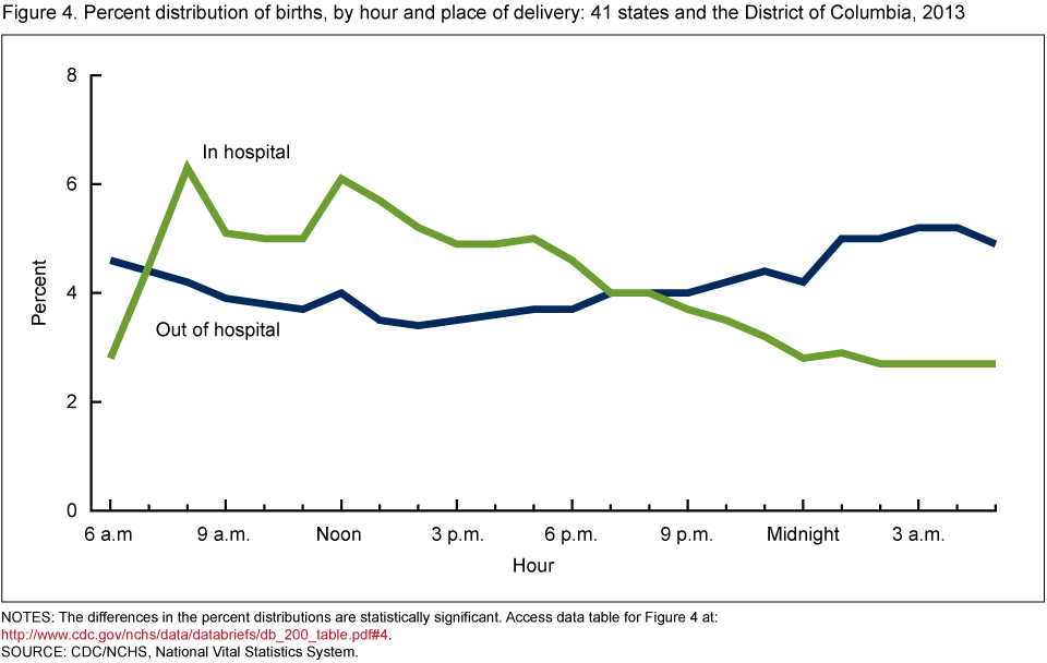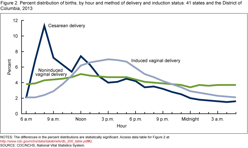 Mathews TJ, Curtin SC. When are babies born: Morning, noon, or night? Birth certificate data for 2013. NCHS data brief, no 200. Hyattsville, MD: National Center for Health Statistics. 2015.