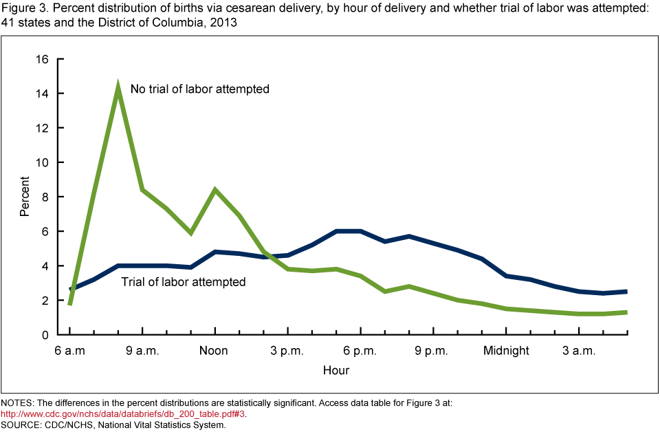 - The percentage of births occurring during the 8:00 a.m. hour (14.3%) for cesareans with no trial of labor was more than three times as high as for cesareans with a trial of labor (4.0%) (Figure 3).