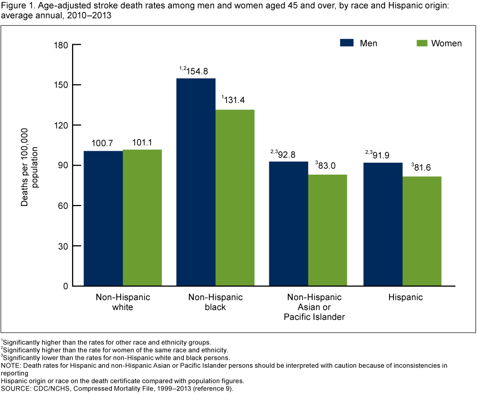 - The age-adjusted stroke death rate for non-Hispanic black men aged 45 and over (154.8 deaths per 100,000 population) was 54% higher than the rate for non-Hispanic white men, 67% higher than the rate for non-Hispanic Asian or Pacific Islander men, and 68% higher than the rate for Hispanic men of the same age (Figure 1).