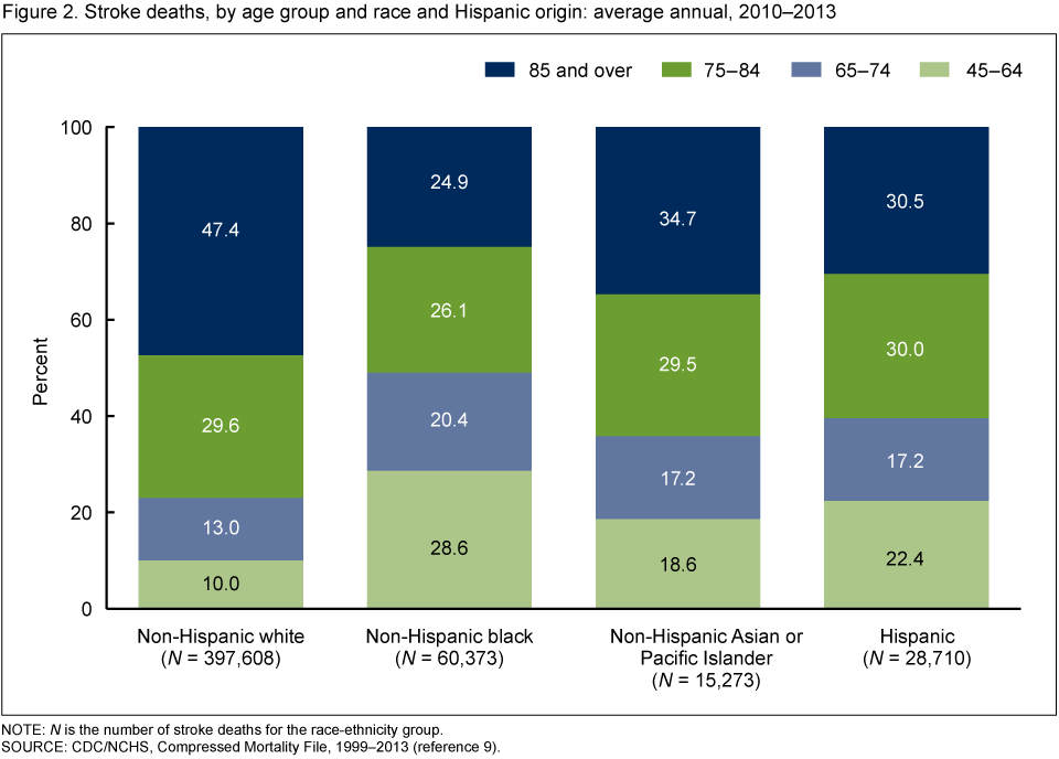 - The portion of stroke deaths in the oldest age group (85 and over) was largest among non-Hispanic white persons (nearly one-half or 47.4%) and smallest among non-Hispanic black persons (one-fourth or 24.9%).