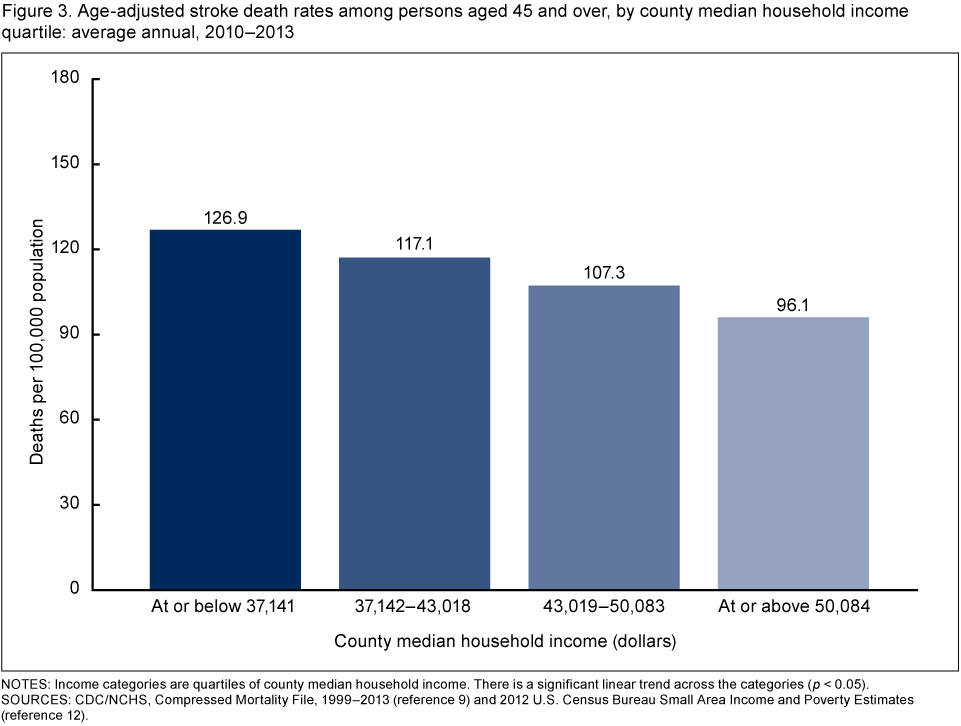 - The age-adjusted stroke death rate for persons residing in counties in the lowest median household income quartile was 32% higher than the rate for persons residing in counties in the highest quartile (126.9 compared with 96.1 deaths per 100,000 population).