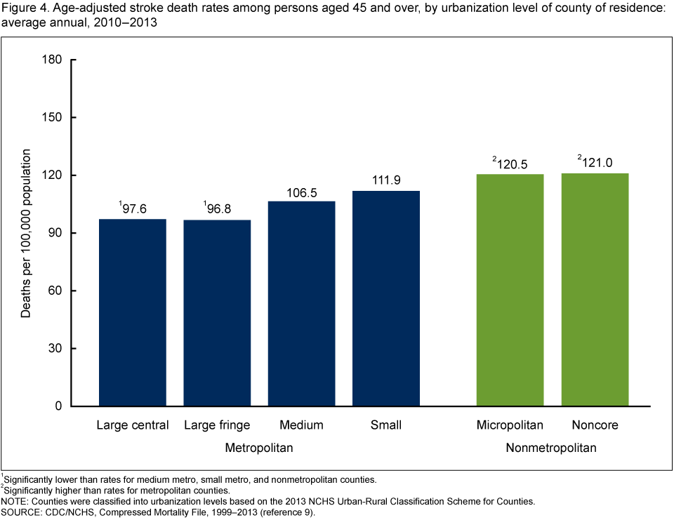 - Among persons aged 45 and over, age-adjusted stroke death rates were highest in nonmetropolitan counties (micropolitan and noncore: 120.5 and 121.0 deaths per 100,000 population) and lowest in large central and large fringe metro counties (97.6 and 96.8) (Figure 4).