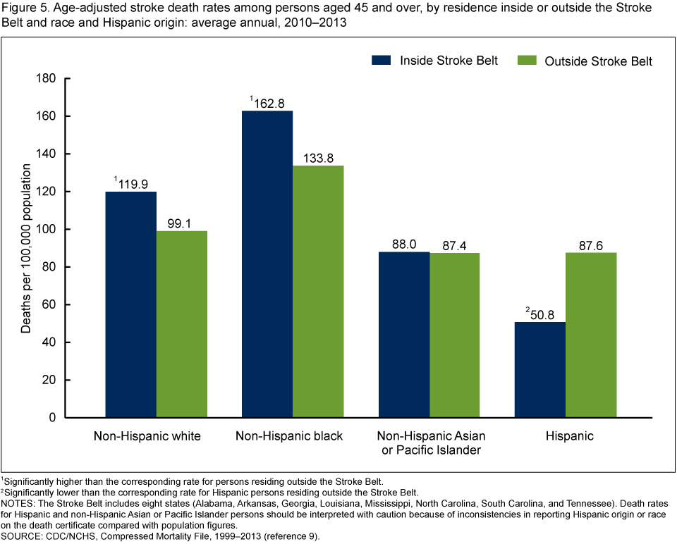- Among persons aged 45 and over, stroke mortality inside and outside the Stroke Belt varied by race and Hispanic origin during 2010–2013.