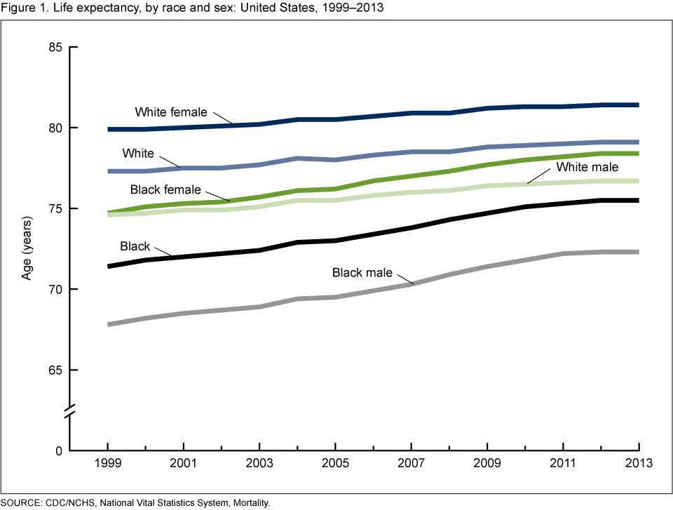 Kochanek KD, Arias E, Anderson RN. Leading causes of death contributing to decrease in life expectancy gap between black and white populations: United States, 1999–2013. NCHS data brief, no 218. Hyattsville, MD: National Center for Health Statistics. 2015.
