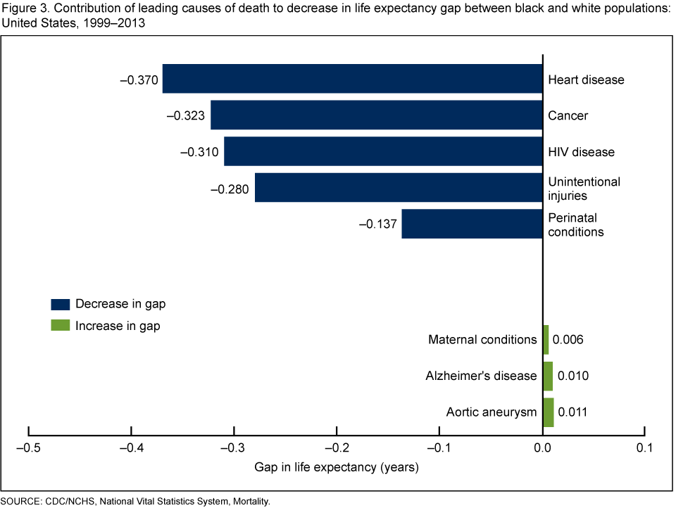 • The decrease in the gap in life expectancy between the black and white populations was due to larger decreases in death rates for the black population for heart disease, cancer, HIV disease, unintentional injuries, and perinatal conditions (Figure 3), which together accounted for 59.1% of the 2.3-year decrease in the gap.