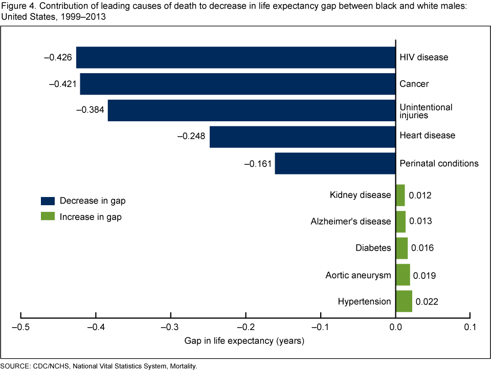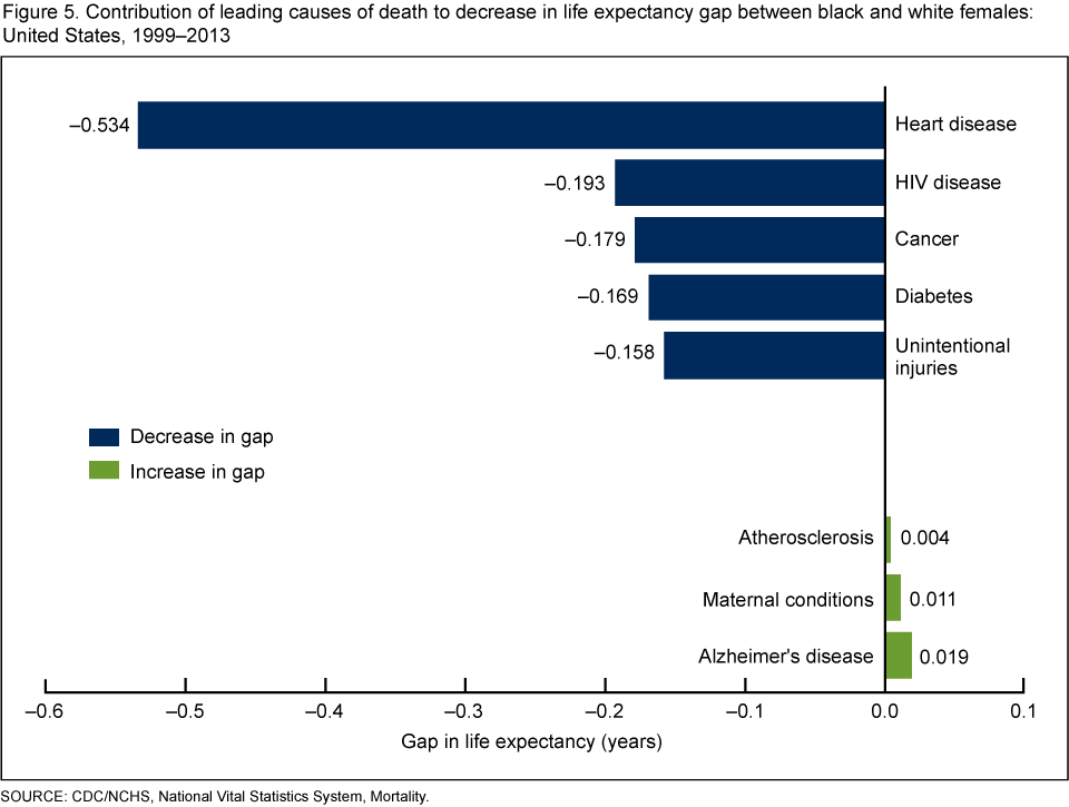 Between 1999 and 2013, the decrease in the life expectancy gap between the black and white populations was mostly due to greater decreases in mortality from heart disease, cancer, HIV disease, unintentional injuries, and perinatal conditions among the black population. Similarly, the decrease in the gap between black and white male life expectancy was due to greater decreases in death rates for HIV disease, cancer, unintentional injuries, heart disease, and perinatal conditions in black males. For black females, greater decreases in diabetes death rates, combined with decreased rates for heart disease and HIV disease, were the major causes contributing to the decrease in the life expectancy gap with white females.