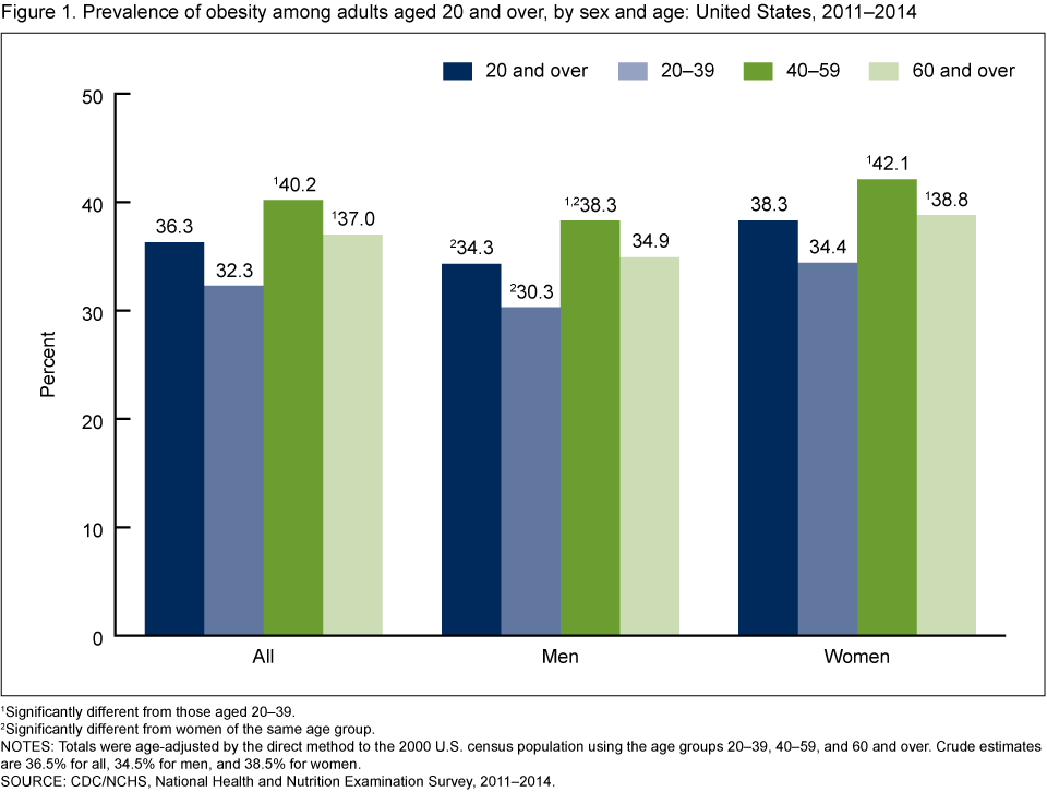 Figure 1. Prevalence of obesity among adults aged 20 and over, by sex and age: United States, 2011–2014