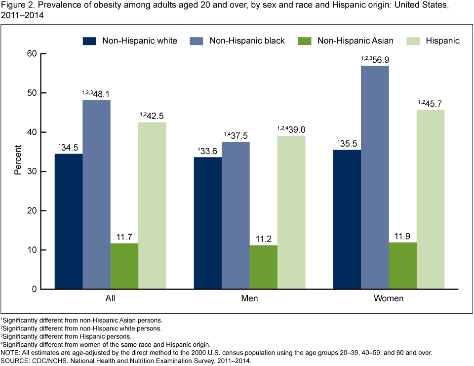 Figure 2 shows the prevalence of obesity among adults aged 20 and over, by sex and race and Hispanic origin, from 2011 through 2014.