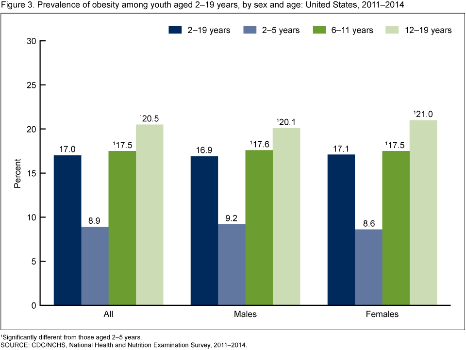 Figure 3 shows the prevalence of obesity among youth aged 2–19 years, by sex and age, from 2011 through 2014.