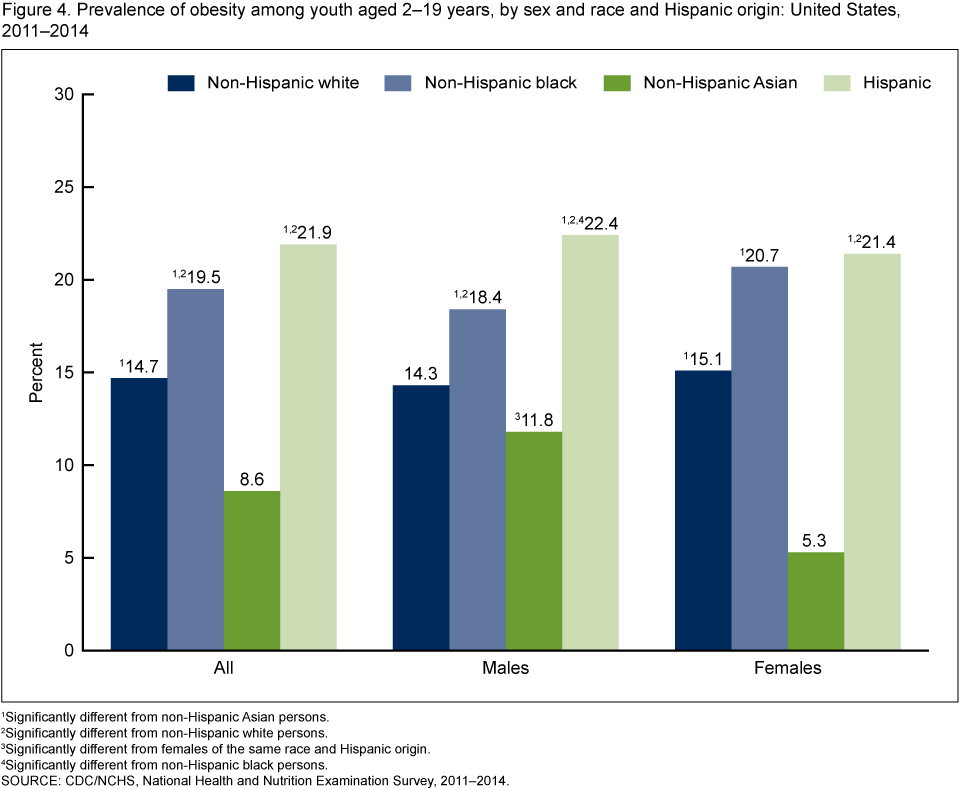 Figure 4 shows the prevalence of obesity among youth aged 2–19 years, by sex and race and Hispanic origin, from 2011 through 2014.