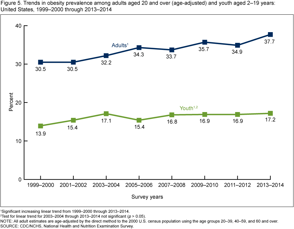 Figure 5 shows trends in obesity prevalence among adults aged 20 and over (age-adjusted) and youth aged 2–19 years, for the time period 1999 through 2014.