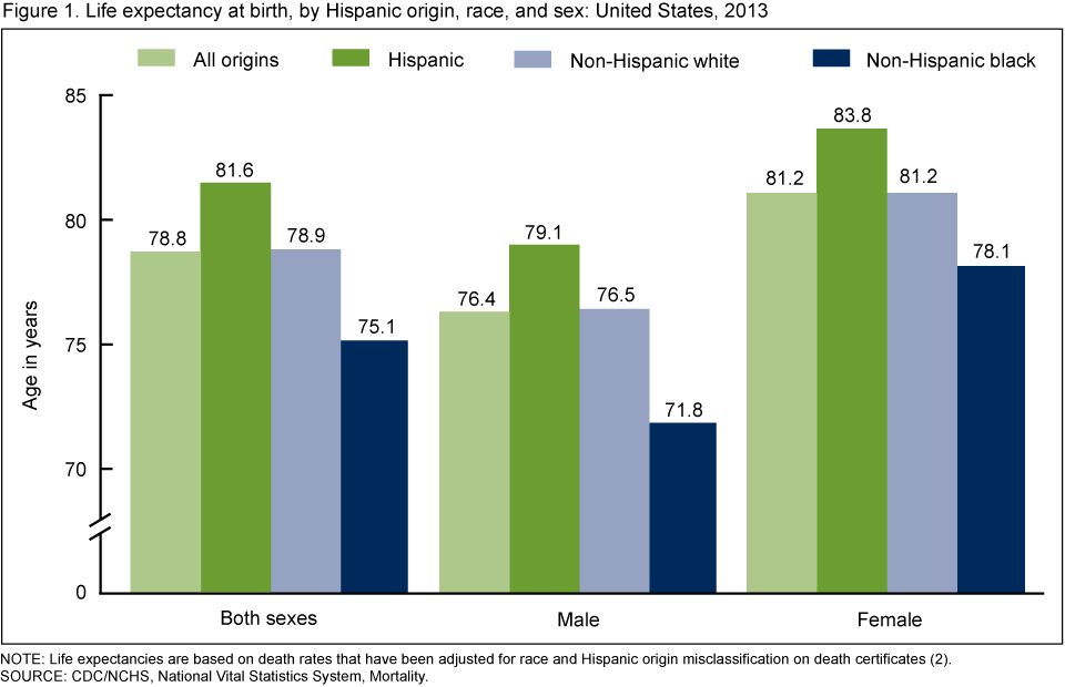 Life expectancy at birth for the total U.S. population in 2013 was 78.8 years. The Hispanic population had a life expectancy (81.6 years) that was 2.7 years greater than the non-Hispanic white population (78.9 years) and 6.5 years greater than the non-Hispanic black population (75.1 years) (Figure 1). Hispanic females had the highest life expectancy at birth (83.8 years), followed by non-Hispanic white females (81.2 years), Hispanic males (79.1 years), non-Hispanic black females (78.1 years), non-Hispanic white males (76.5 years), and non-Hispanic black males (71.8 years) (5).