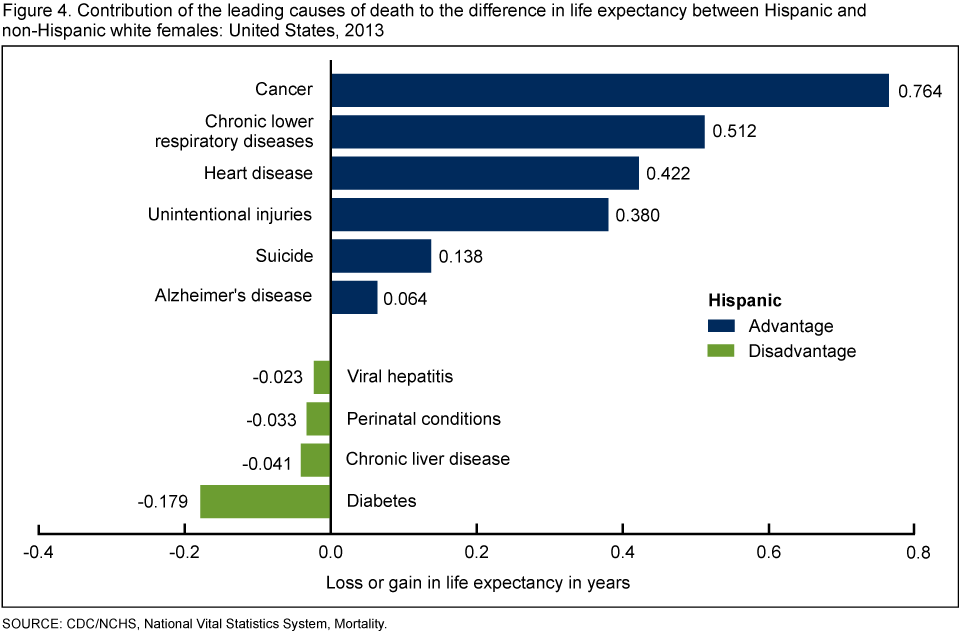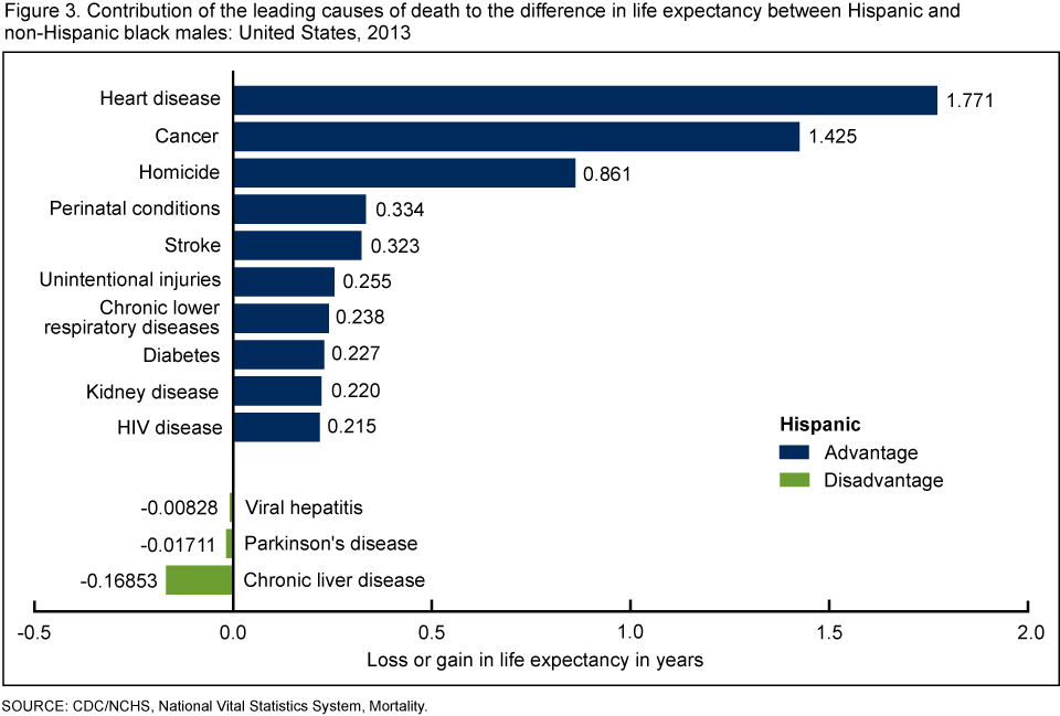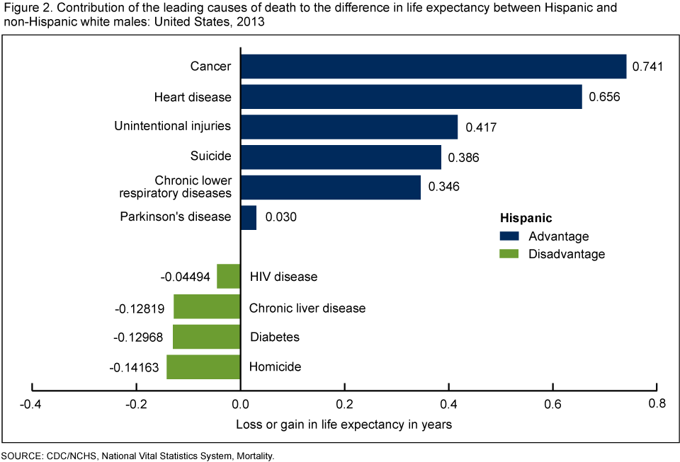 • Life expectancy at birth for Hispanic males was higher by 2.6 years than that of non-Hispanic white males because of lower death rates due to cancer, heart disease, unintentional injuries, suicide, chronic lower respiratory diseases, and Parkinson’s disease (Figure 2). Lower death rates for these causes accounted for 83% of the Hispanic male advantage.