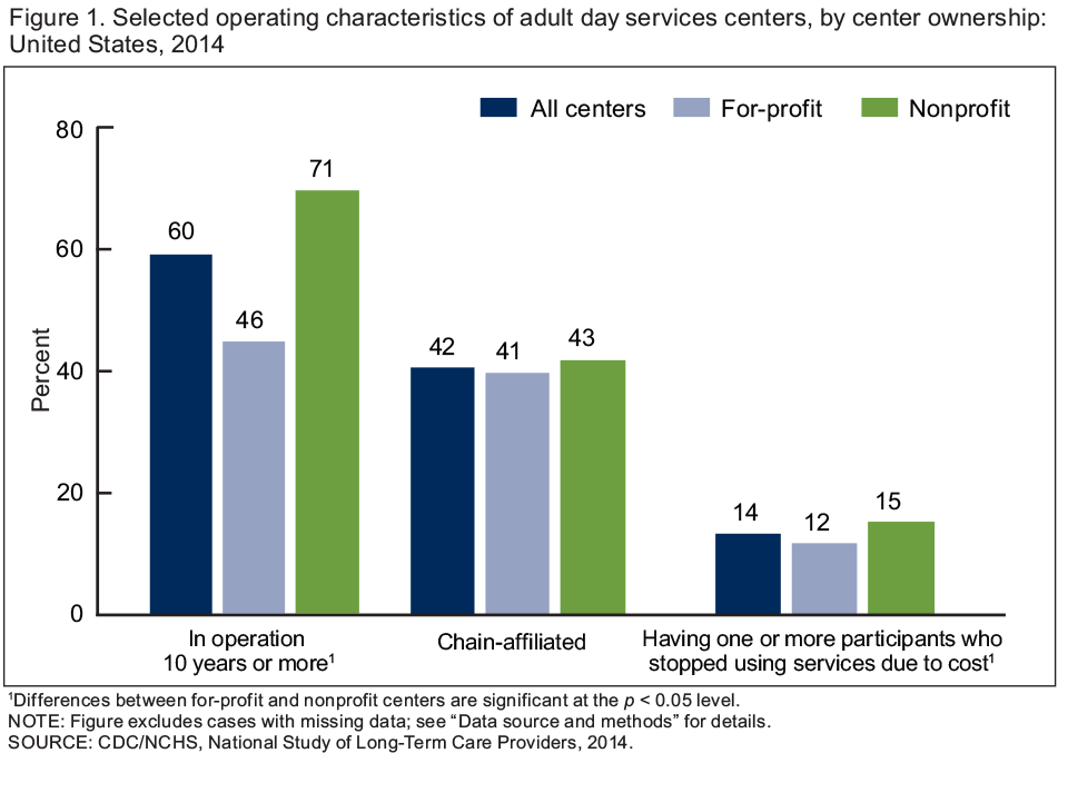 Rome V, Harris-Kojetin LD, Park-Lee E. Variation in operating characteristics of adult day services centers, by center ownership: United States, 2014. NCHS data brief, no 224. Hyattsville, MD: National Center for Health Statistics. 2015.
