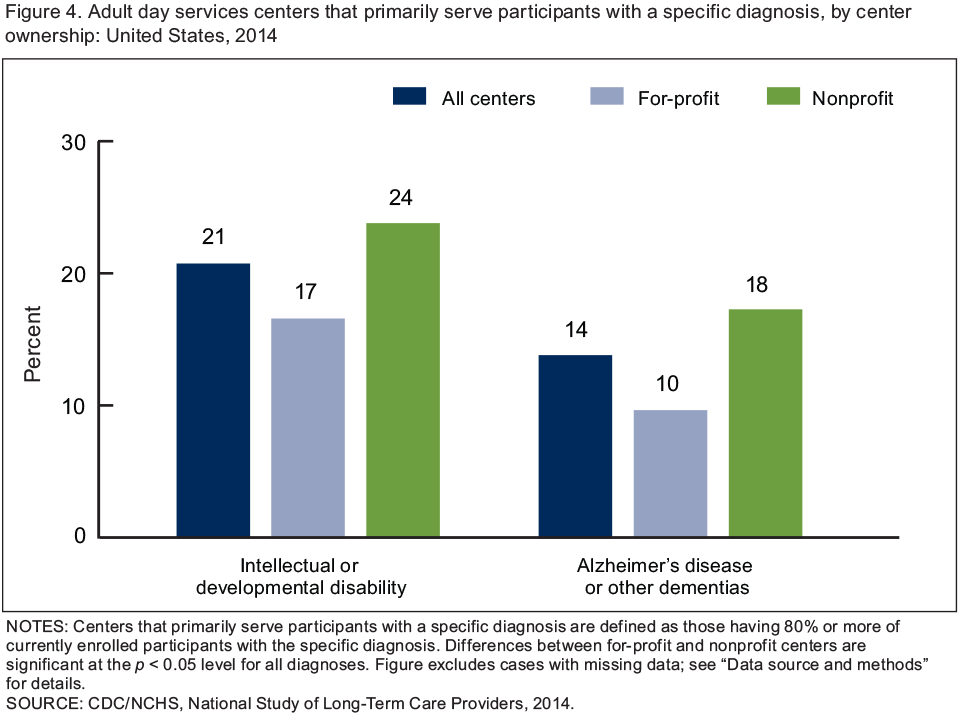 5. Dwyer LL, Harris-Kojetin LD, Valverde RH. Differences in adult day services center characteristics by center ownership: United States, 2012. NCHS data brief, no 165. Hyattsville, MD: National Center for Health Statistics. 2014.