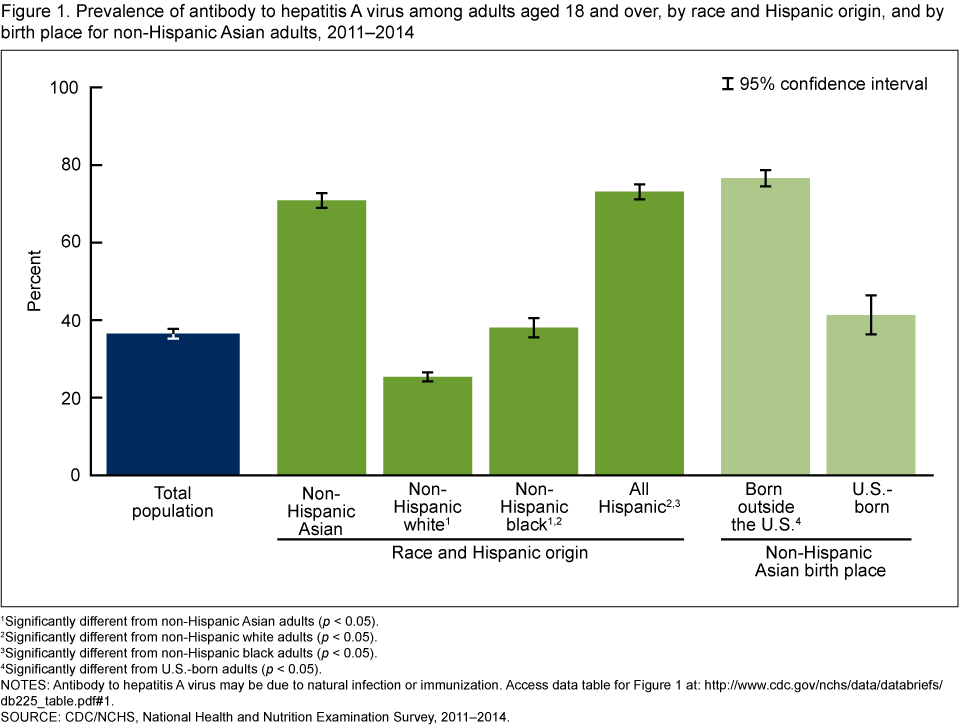 During 2011–2014, the prevalence of antibody to HAV, which may be due to natural infection or immunization, was 36.5% among U.S. adults aged 18 and over (Figure 1). Among non-Hispanic Asian adults, the prevalence of antibody to HAV was 70.9%, which was higher than among non-Hispanic white (25.4%) and non-Hispanic black (38.0%) adults but was similar to Hispanic (73.1%) adults.