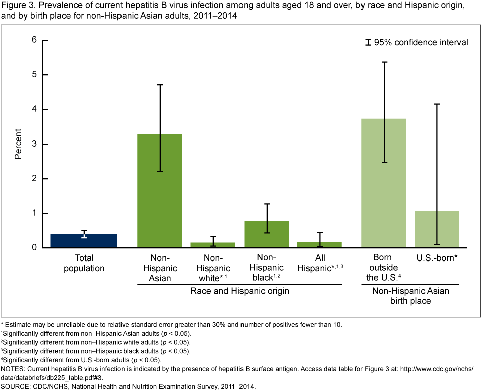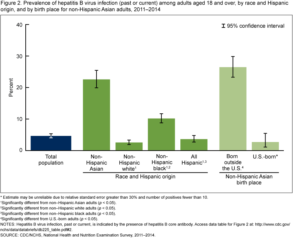 - Prevalence of both past or current hepatitis B virus (HBV) infection as well as just current active HBV infection was higher among non-Hispanic Asian adults than non-Hispanic white, non-Hispanic black, and Hispanic adults.