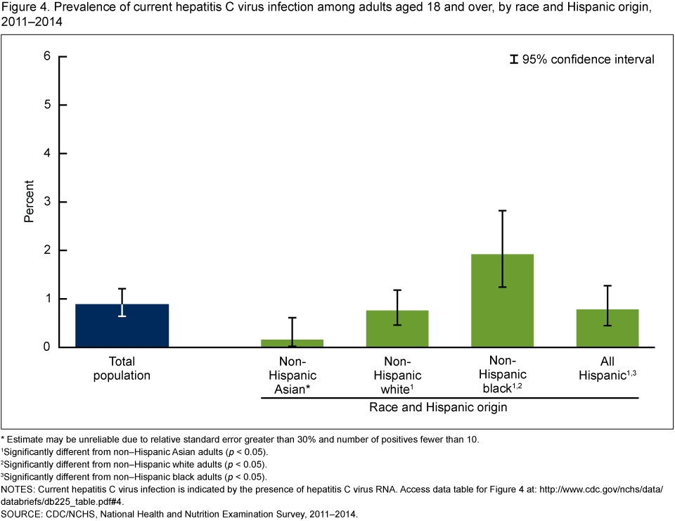 Estimates of current HCV infection vary among Asian countries, from 0.1%–4.4% (4). Although NHANES oversamples non-Hispanic Asian persons, the Asian sample is still very small to estimate conditions with low prevalence, such as HCV infection (less than 1% in the total population and less than 2% for any specific race and Hispanic origin subgroup).