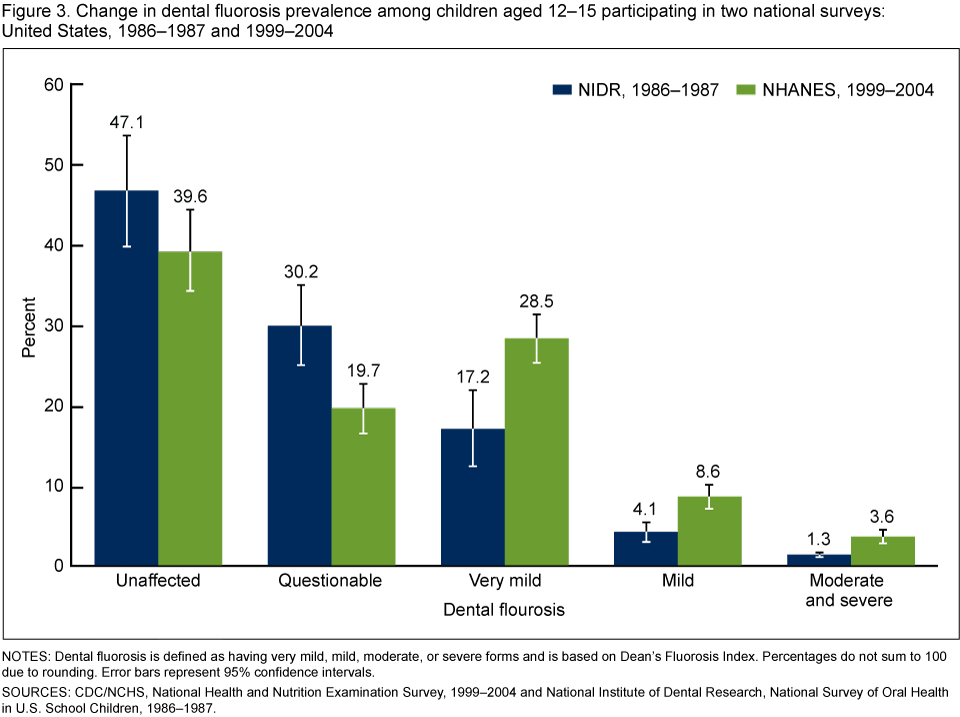 - Adolescents aged 12-15 in 1999-2004 had a higher prevalence of dental fluorosis than adolescents aged 12-15 in 1986-1987.