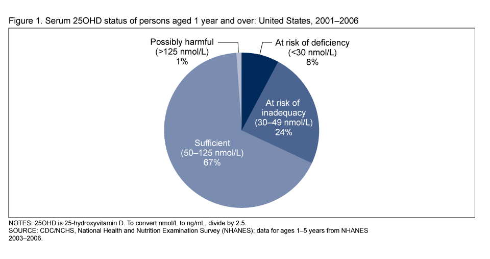 - In 2001–2006, two-thirds of the population had sufficient vitamin D, defined by the Institute of Medicine as a serum 25-hydroxyvitamin D (25OHD) value of 50–125 nmol/L. About one-quarter were at risk of vitamin D inadequacy (serum 25OHD 30–49 nmol/L), and 8% were at risk of vitamin D deficiency (serum 25OHD less than 30 nmol/L).