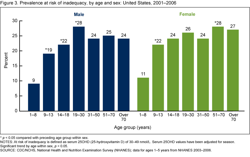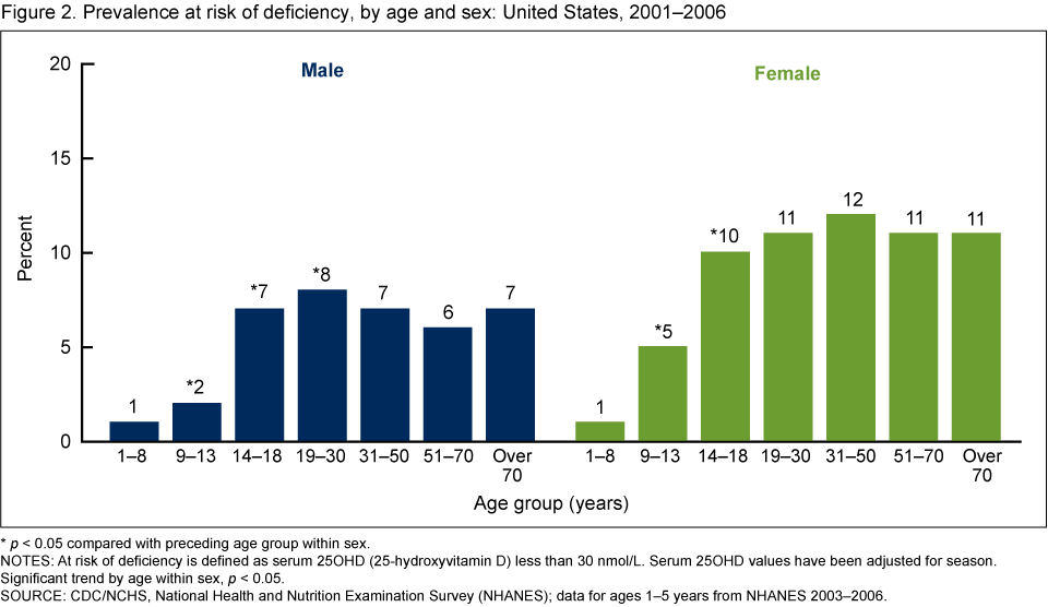 - The risk of vitamin D deficiency differed by age, sex, and race and ethnicity. The prevalence was lower in persons who were younger, male, or non-Hispanic white. Among women, the prevalence at risk was also lower in pregnant or lactating women.