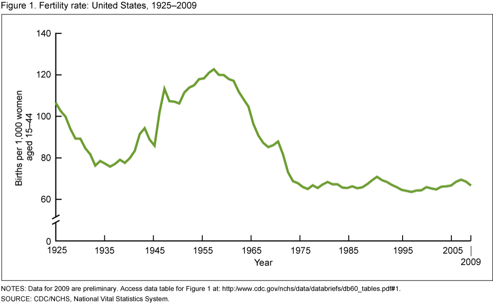 - From 2007 through 2009, the fertility rate fell 4 percent from 69.5 to 66.7 births per 1,000 women aged 15–44.
