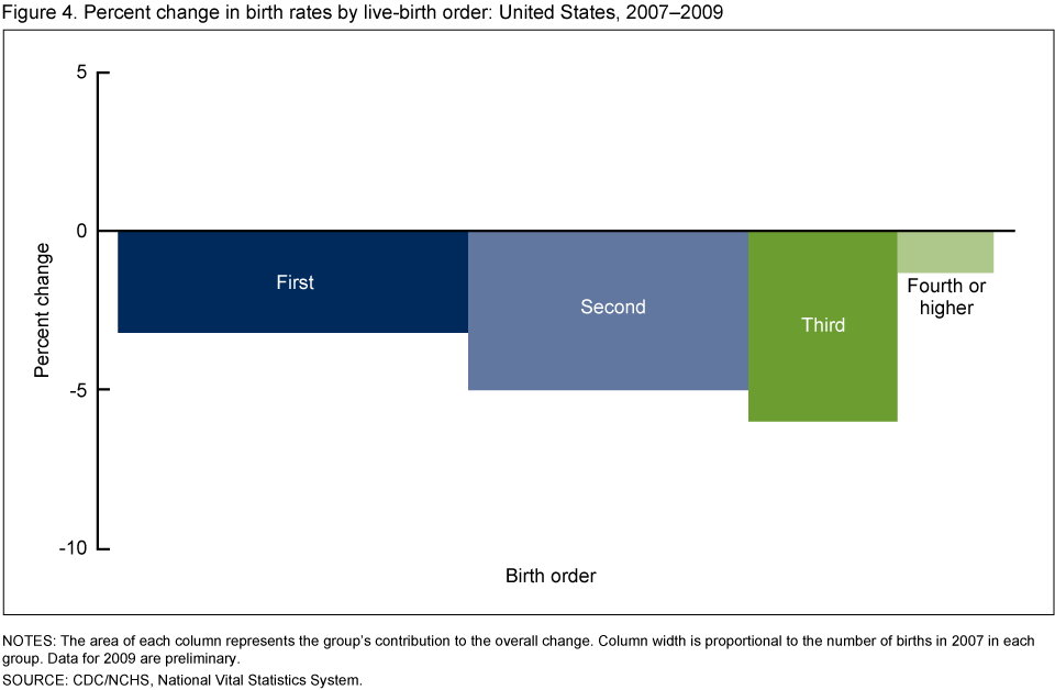 - Birth rates by live-birth order also fell with the largest declines for third-order births and progressively smaller declines for second- and first-order births.
