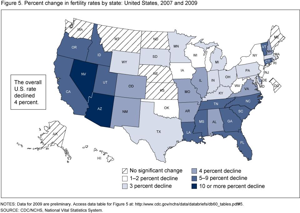 Sutton PD, Hamilton BE, Mathews TJ. Recent decline in births in the United States, 2007–2009. NCHS data brief, no 60. Hyattsville, MD: National Center for Health Statistics. 2011.