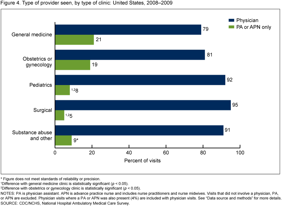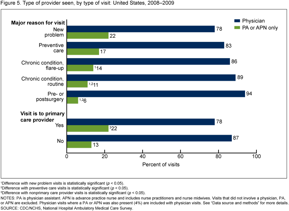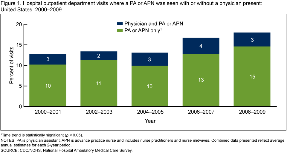 - Hospital outpatient department visits attended only by physician assistants (PAs) or advance practice nurses (APNs) increased by 50% from 2000–2001 (10%) through 2008–2009 (15%).