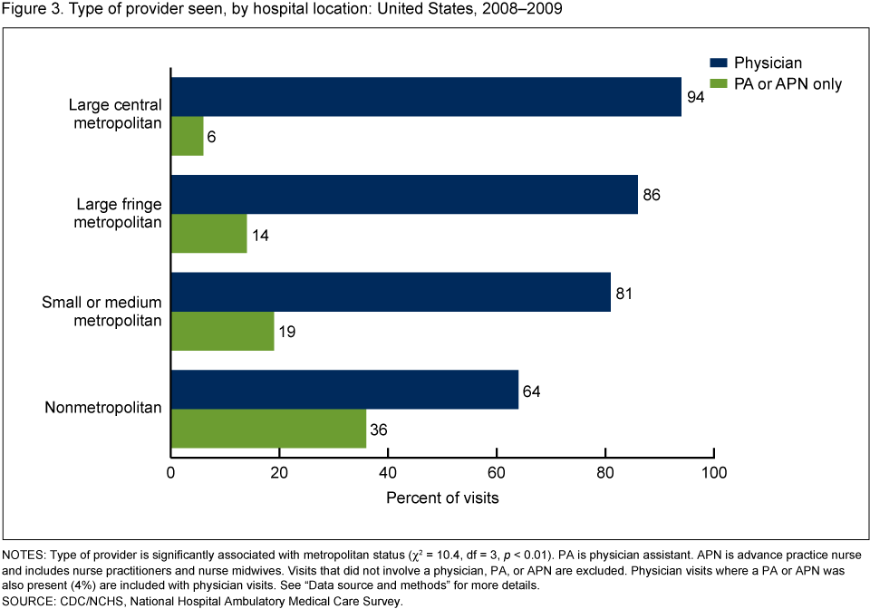 - The more urban the hospital location, the lower the percentage of visits seen only by PAs or APNs; decreasing from 36% in nonmetropolitan areas to 6% in large central metropolitan areas.