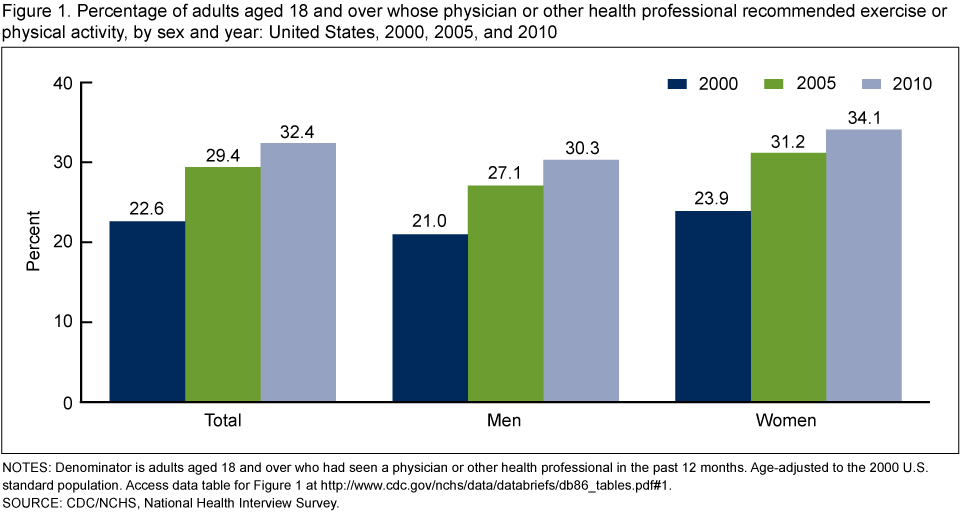 Barnes PM, Schoenborn CA. Trends in adults receiving a recommendation for exercise or other physical activity from a physician or other health professional. NCHS data brief, no 86. Hyattsville, MD: National Center for Health Statistics. 2012.