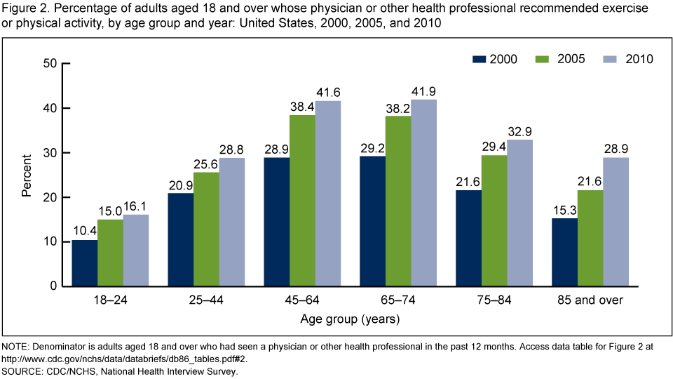 • Among adults aged 85 and over, the percentage receiving advice to exercise nearly doubled between 2000 (15.3%) and 2010 (28.9%).