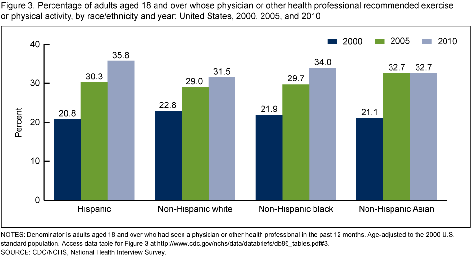 Figure 3 is a bar chart showing the percentage of adults aged 18 years and over whose physician or other health professional recommended exercise or physical activity, by race/ethnicity and year: United States, 2000, 2005, and 2010