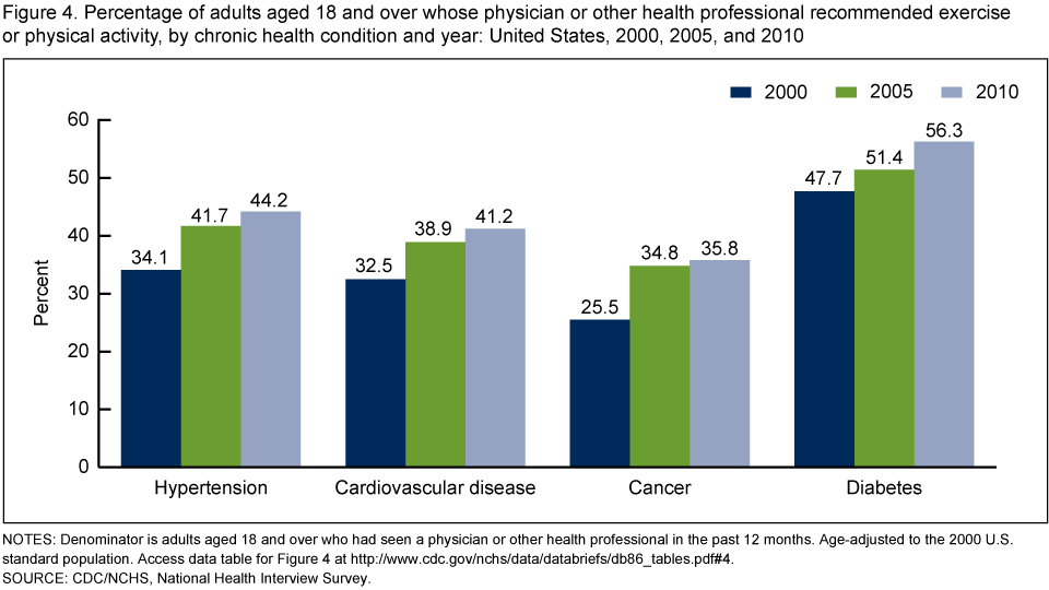 • Between 2000 and 2010, receipt of advice from a physician to do exercise or physical activity increased for adults with hypertension, cardiovascular disease, cancer, and diabetes (Figure 4).