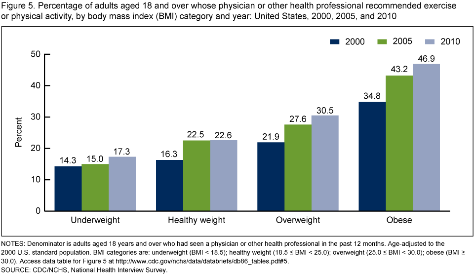Figure 5 is a bar chart showing the percentage of adults aged 18 years and over whose physician or other health professional recommended exercise or physical activity, by body mass index (BMI) category and year: United States, 2000, 2005, and 2010