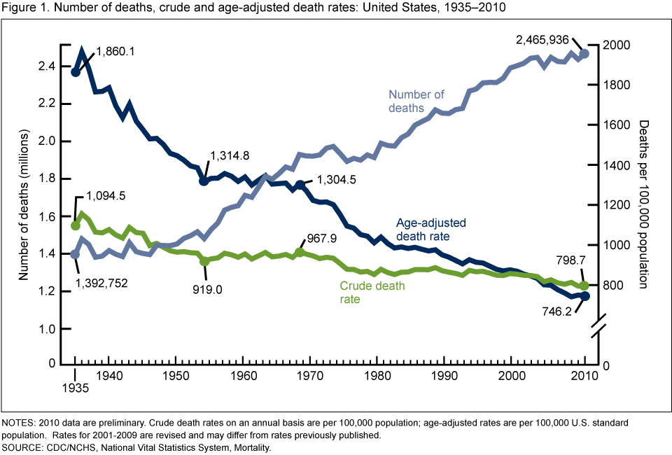 While the total number of deaths increased by 1.1 million between 1935 and 2010, the risk of dying decreased. The crude death rate fell 27 percent from 1,094.5 to 798.7 deaths per 100,000 population between 1935 and 2010. The improvement in the risk of dying was actually larger than 27 percent because the U.S. population was getting older over this time period. When the effect of the aging of the population is removed by calculating an age-adjusted death rate to examine the risk if the population age distribution was like that in 2000 for all years, the risk of dying decreased by 60 percent from 1935 to 2010.