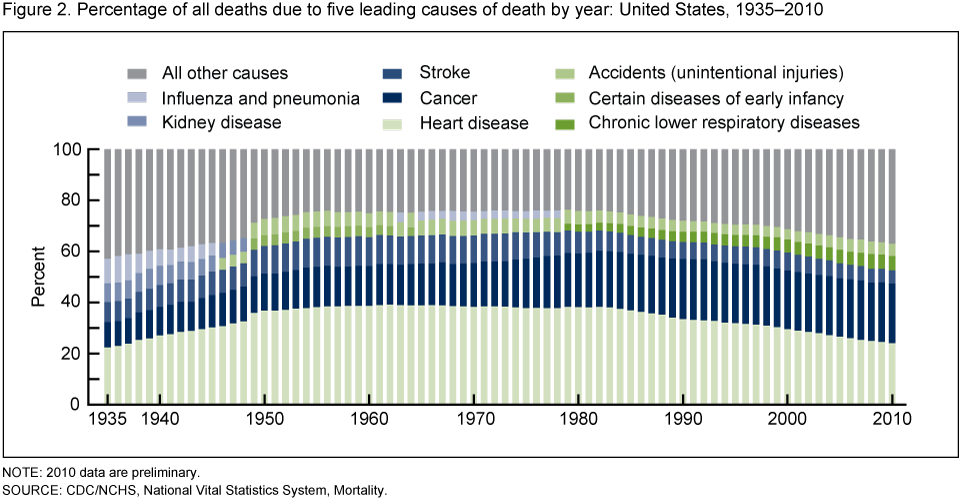 Figure 2. Percentage of all deaths due to five leading causes of death by year: United States, 1935–2010