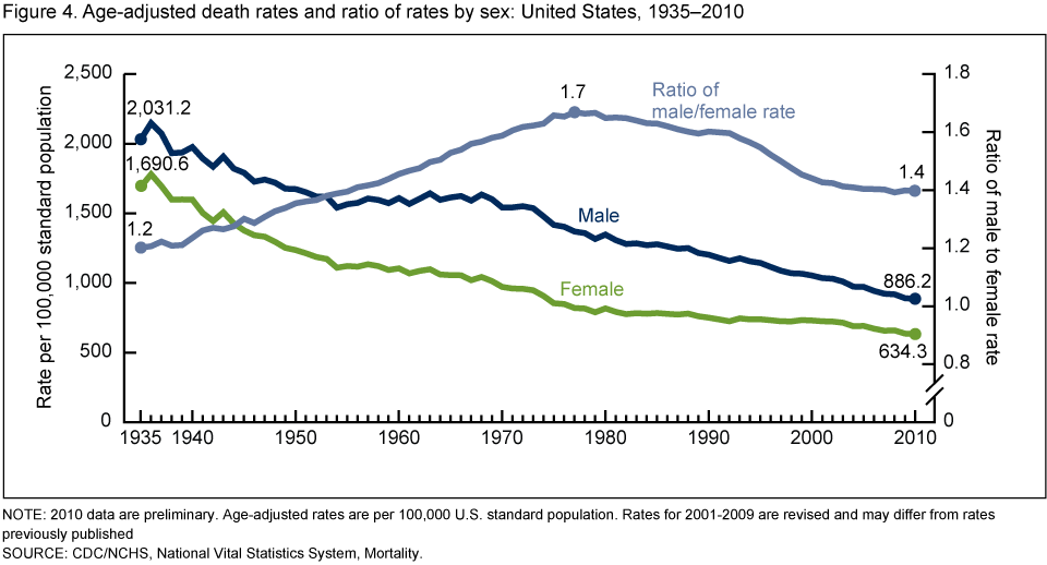 - Age-adjusted death rates were consistently greater for males than females (for example, 65 percent higher than those for females between 1975 and 1981 compared with 40 percent higher in 2010) as each decreased substantially between 1935 and 2010.