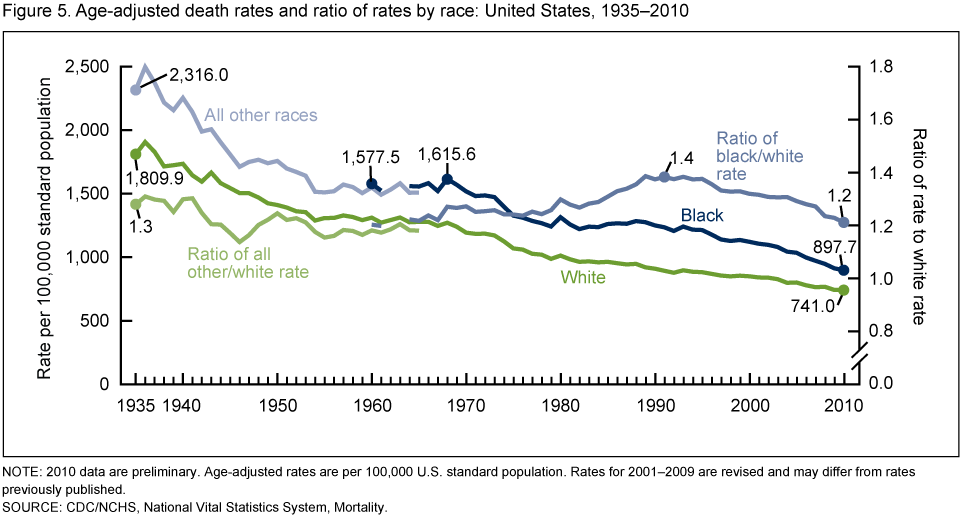 Figure 5. Age-adjusted death rates and ratio of rates by race: United States, 1935–2010