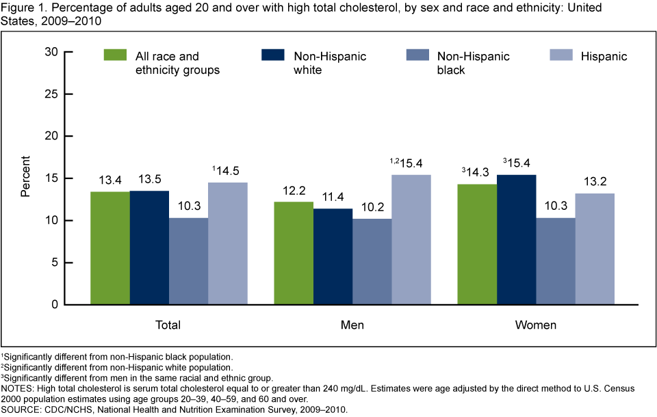An estimated 13.4% of adults aged 20 and over had high total cholesterol in 2009–2010 (Figure 1). The percentage with high total cholesterol was higher in women (14.3%) than in men (12.2%) and in non-Hispanic white women (15.4%) than in non-Hispanic white men (11.4%).